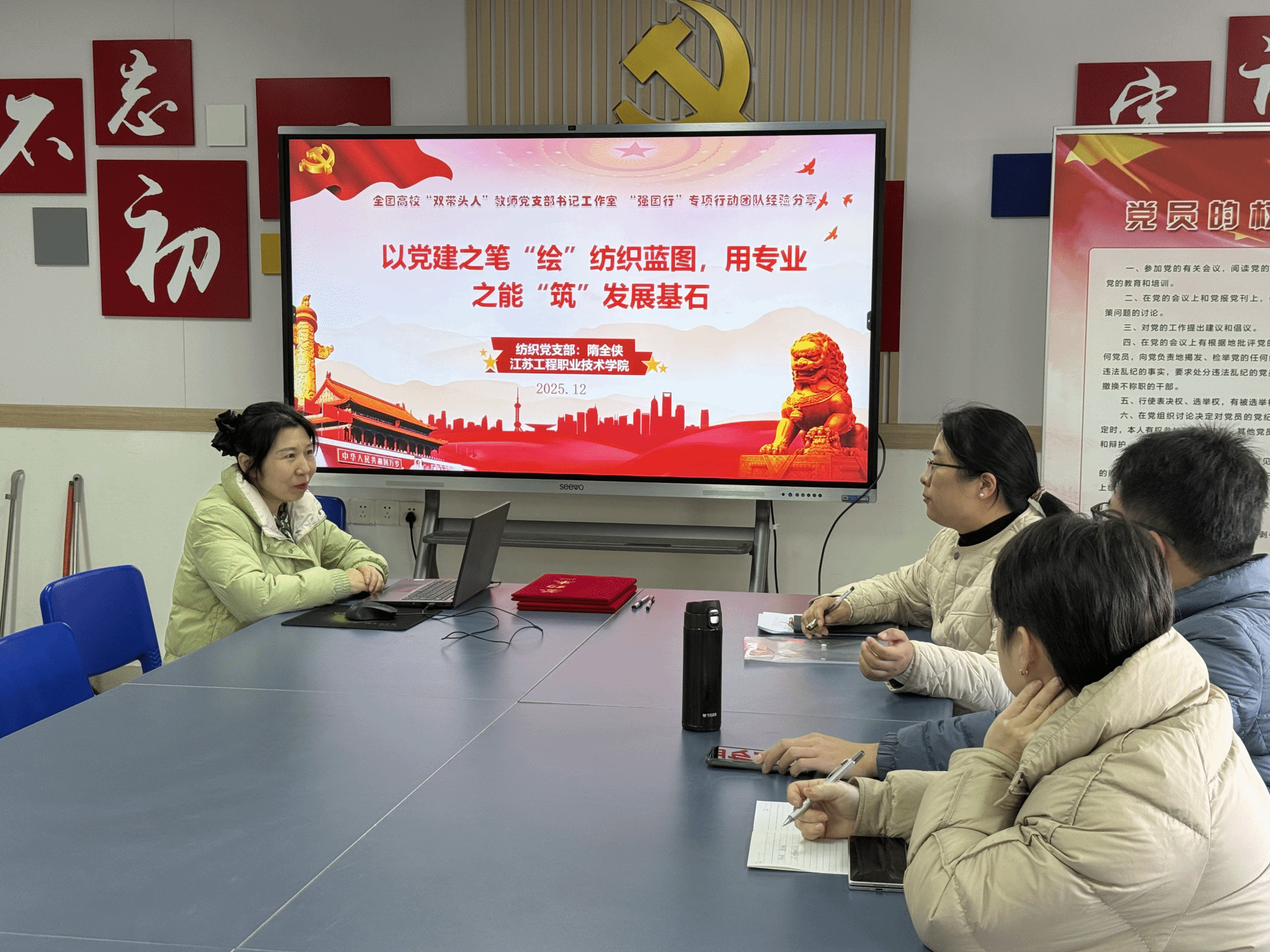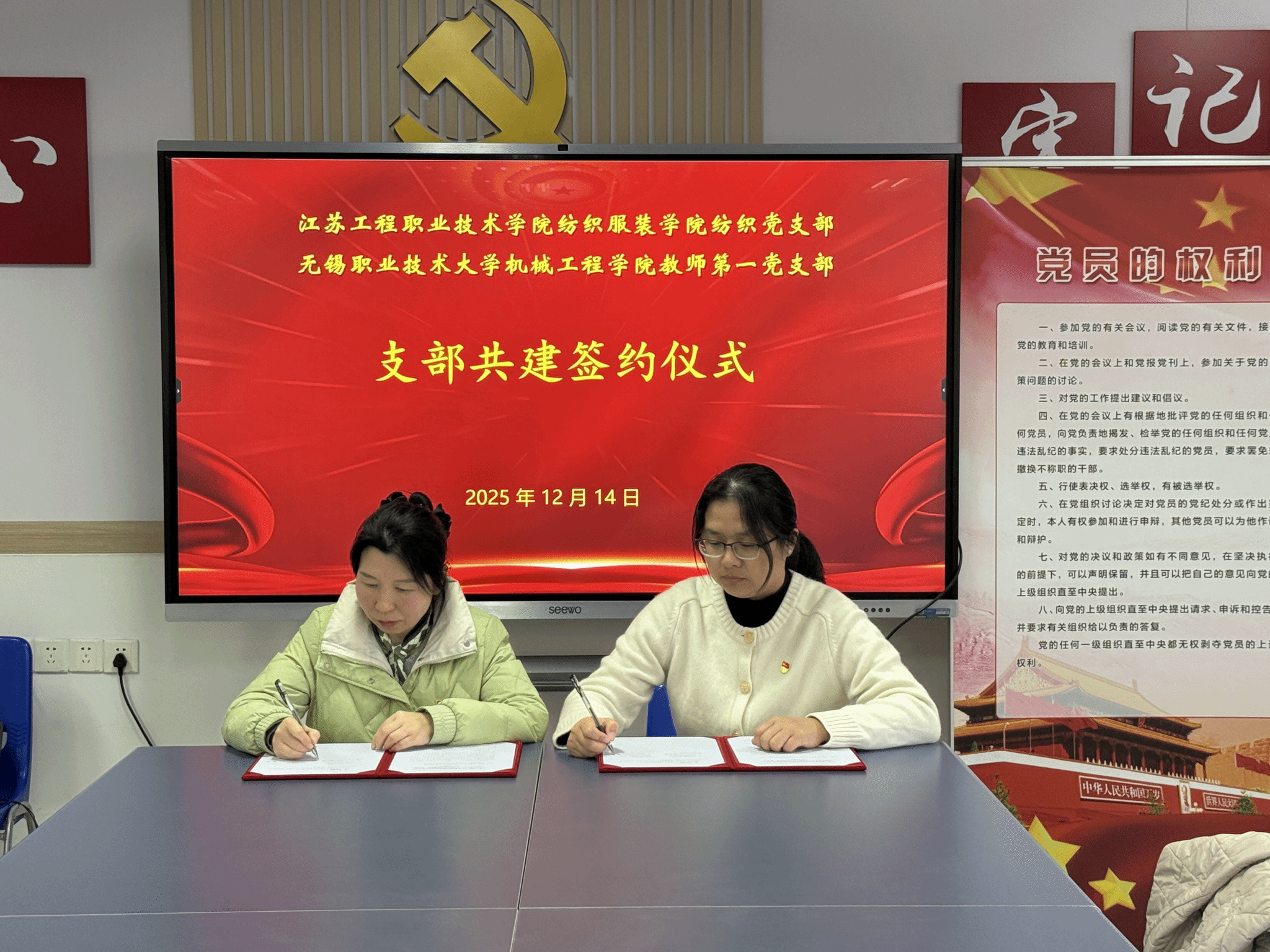 14日上午,党员们前往江苏工程职业技术学院纺织服装学院,专程拜访第三批全国高校“双带头人”教师党支部书记工作室负责人、纺织党支部书记隋全侠教授。隋教授详细分享了其在“双带头人”工作室申报、建设以及党建引领事业发展方面的宝贵经验和创新举措。双方就如何有效发挥党支部书记“头雁效应”、激发支部活力、推进党建与业务双融双促等议题进行了深入探讨。机械工程学院教师第一党支部与纺织服装学院纺织党支部签署了党建共建协议,约定未来将在组织联动、活动联办、资源共享等方面加强合作,共同提升基层党建工作质量。